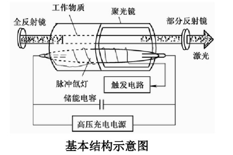 工作物質、泵浦系統、諧、振腔和冷卻、綠光系統構成的。下圖則是長脈沖固體激光器基本結構的示意圖(冷卻、濾光系統未畫出)。